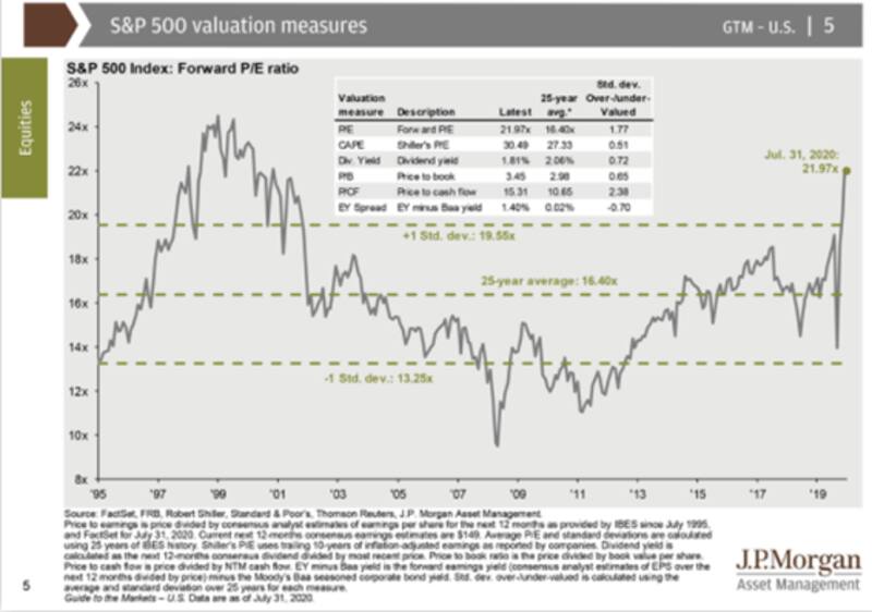 Según los analistas de JP Morgan, el ratio Forward Price Earning del selectivo s&p500 se encuentra en niveles de 21,9 veces ganancias a comienzo del mes de agosto, lo que implica niveles cercanos a los que registró el mercado americano a finales de los años 90 y previo al inicio de la crisis de la punto com.