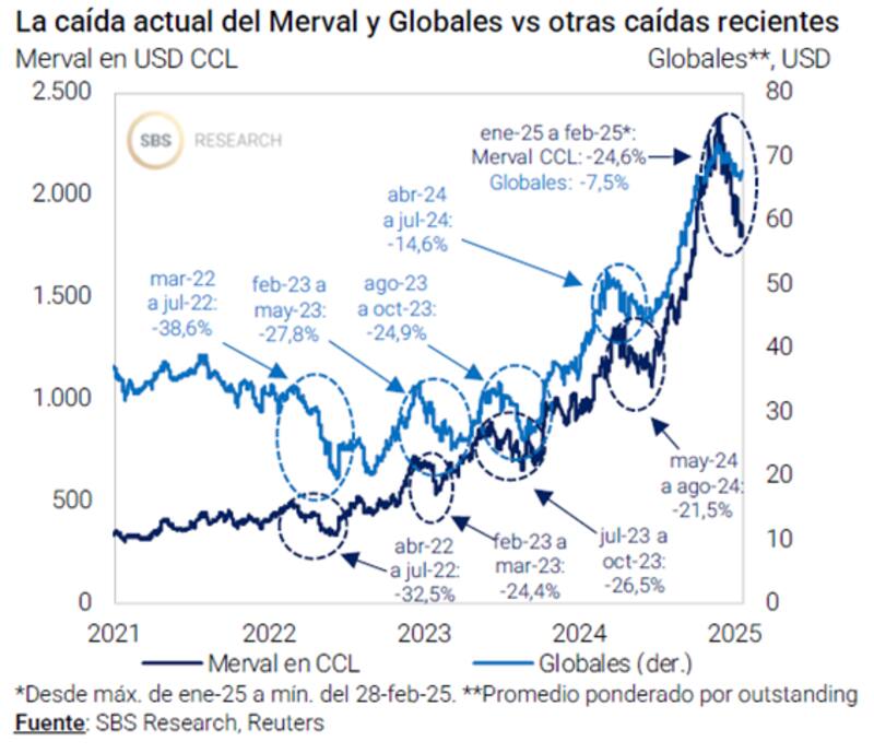 Entre abril y julio de 2024, la bolsa local cedió hasta casi 15% de su valor. Entre agosto y octubre de 2023, las bajas fueron del 25%. El mayor ajuste reciente fue el que se dio entre marzo y julio de 2022, cuando el S&P Merval cayó casi 39%.