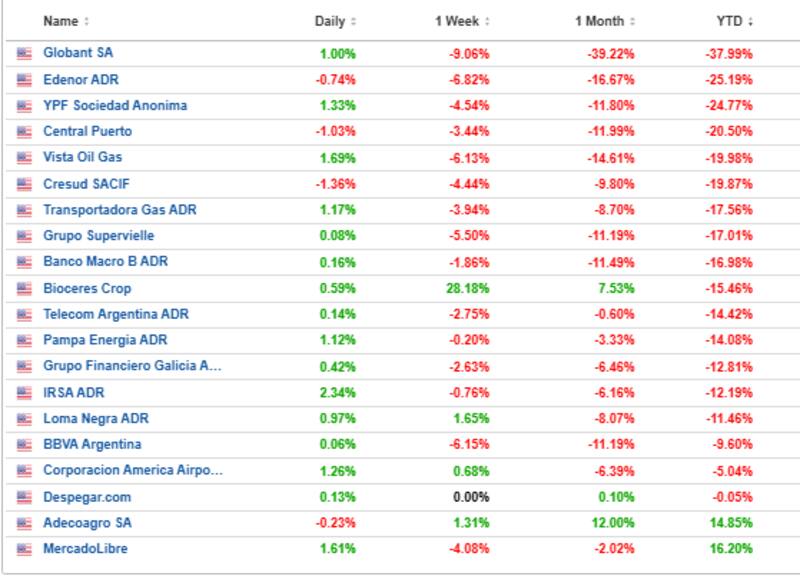 Cuando se analiza la performance de las acciones argentinas este año, el balance es negativo. Las mayores bajas se dan en Globant, que cae este año un 38%. Le sigue Edenor, con una merma de 25%, YPF baja 24% y Central Puerto retrocede 20%.