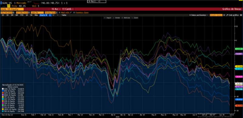 Por su parte, papeles como Cresud, Vista y Pampa, muestran descensos de entre 18% y 26%, mientras que las acciones que menos bajan se encuentran TGS e IRSA, con caídas del 9% y 6% desde los picos del año.