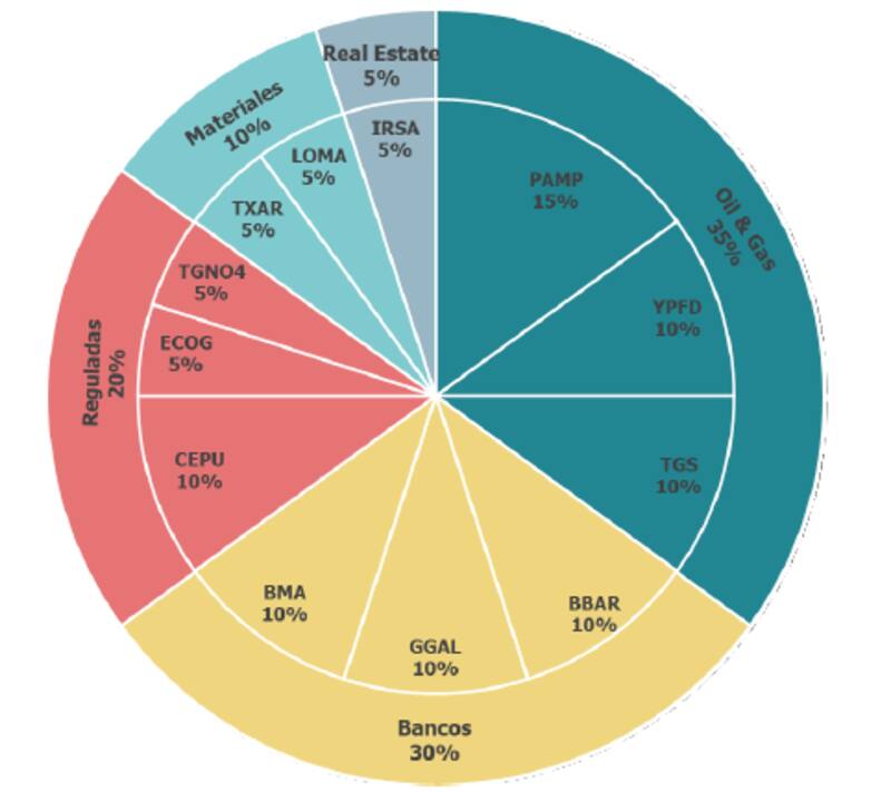 Le asignan un 30% a bancos, entre Banco Macro, Galicia y BBVA Argentina. Además, recomiendan un 20% en reguladas con Central Puerto, EcoGas y TGN. Se posiciona un 10% en materiales, con Ternium y Loma Negra y un 5% en Real Estate, a través de IRSA.