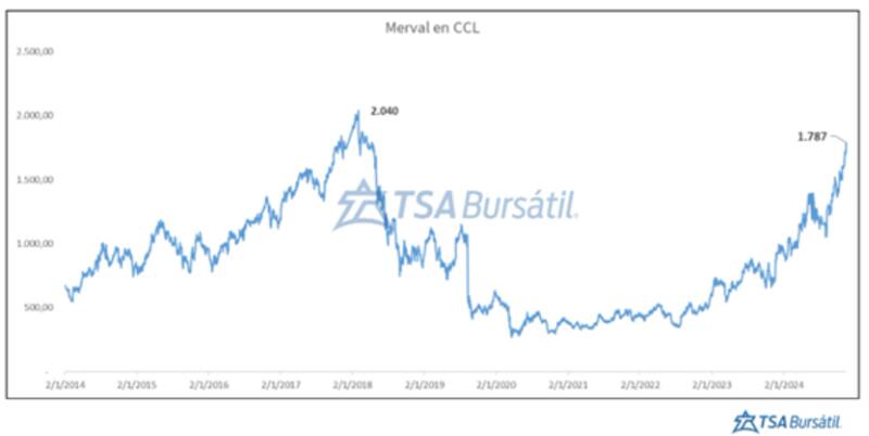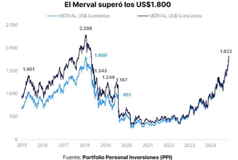 El S&P Merval en dólares (CCL) superó los u$s 1800 vistos en el mejor momento de Mauricio Macri, por lo que en términos nominales, el mismo se encuentra en máximos históricos.