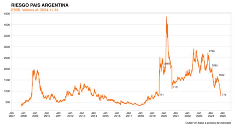 Esto permitió que, así como el S&P Merval quebró máximos, el riesgo país perforó los 800 puntos, ubicándose en mínimos desde 2019.