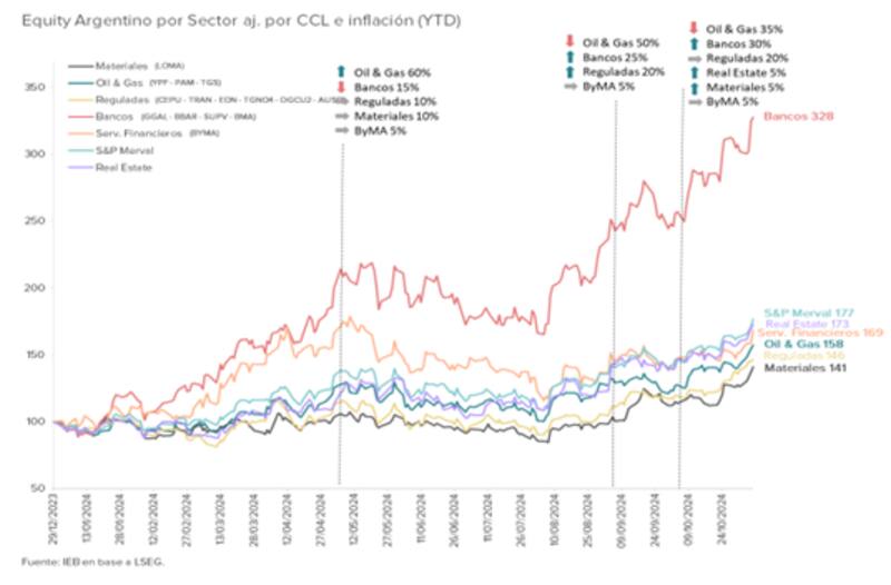 Le siguen las acciones del sector bancario, con Grupo Financiero Galicia subiendo 255%, Banco Macro 216% y Grupo Supervielle, con una ganancia de 168% en lo que va del 2024.