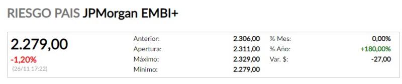 El riesgo país cedió 27 unidades, hasta los 2279 puntos básicos. Fuente: Rava.