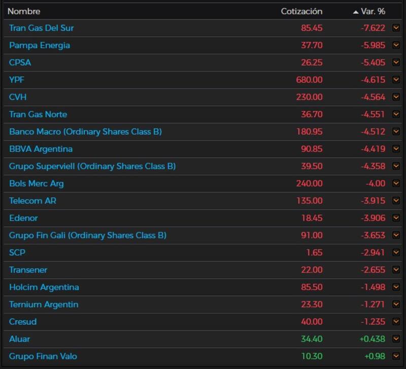 La caída del S&P Merval se explicaba por deterioros entre la casi todas las acciones que componen su panel. Entre las bajas, se destacaban los rojos que mostraban los papeles de Transportadora de Gas del Sur (-7,6%), de Pampa Energía (-5,9%) y de Central Puerto SA (-5,4%).