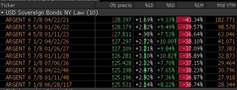 Mejor fue el panorama, incluso, para los instrumentos de renta fija. Los bonos soberanos en dólares bajo ley extranjera crecían levemente este lunes, entre un 1% y 3,2% siguiendo el humor de los índices de referencia de Wall Street.
