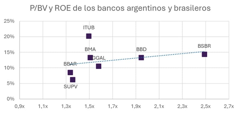 "Los balances de bancos probablemente sean desfavorables y podrían frenar momentáneamente el rally del mercado actual. Actualmente los bancos operan a 1.3x-1.5x veces libros, alrededor del promedio de los últimos 5 años, aunque bien alejados de enero 2025, donde cotizaron a 2.5x o 2018, cuando superaron 3.0x. En Brasil los bancos Santander y Bradesco 2.4x y 1.9x, respectivamente) cotizan a una prima mientras que Itaú está alineado (1.4x)", detallaron desde Don Capital.