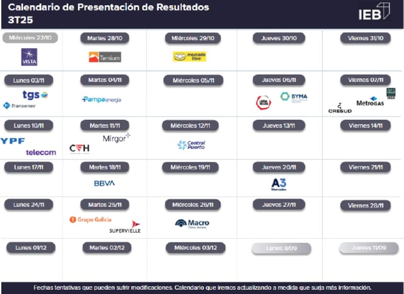 Finalmente, para cerrar el mes, llegarán los balances del sector financiero con BBVA Argentina el martes 18 y A3 el jueves 20. Luego, el 25 de noviembre será el turno de Galicia y Supervielle y el miércoles 26 de noviembre le tocará a Banco Macro dar a conocer sus números.