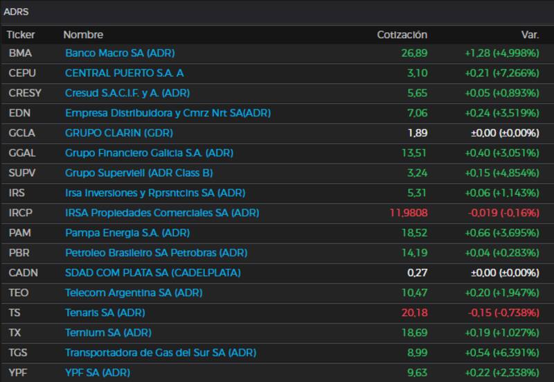 Por su parte, los adrs mostraron mayoría de números positivos. En Nueva York, sobresalieron los papeles de Central Puerto (+7,26%), Transportadora de Gas del Sur (+6,39%) y Banco Macro (+4,99%).