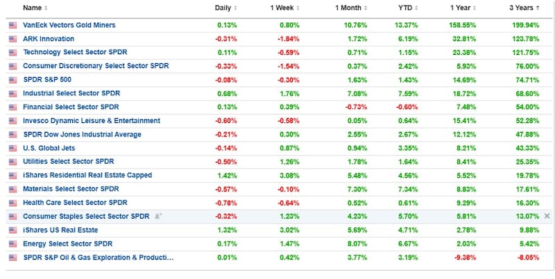 Tomando otros sectores, se destaca que el de mineras de oro (GDX) sube 200% en los últimos 3 años, seguido por el de tecnología a largo plazo (ARKK), y más abajo el tecnológico que avanzó 123% en 3 años.