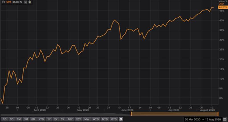 Las rápidas políticas fiscales y monetarias aplicadas para enfrentar la crisis del coronaviruspermitieron ver una mejora en los precios de los activos financieros, permitiendo que el mercado especule con una recuperación en tipo “V . Por ello el mercado americano subió 46% desde el piso de marzo hasta los valores actuales y ha regresado a zona de máximos previos. Sin embargo, dicha recuperación del mercado no garantiza que EEUU logre evitar el fuerte traspié desde el lado económico actual y futuro.