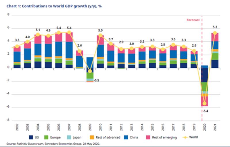 Según los cálculos de Schroders, se espera que el crecimiento de EE.UU. caiga 8,2% en 2020 con descensos concentrados en la primera mitad del año. A medida que se levante el bloqueo y se reinicie, la actividad, la economía debería recuperarse en la segunda mitad. En la zona euro esperan que la actividad caiga 6,1% en a la vez que pronostican que la economía en Reino Unido tendrá una de las recesiones más profundas, y es probable que el PBI caiga un 8,5% en 2020. En mercados emergentes se pronostica una contracción en las economías en 2020 del orden del 2,8%.