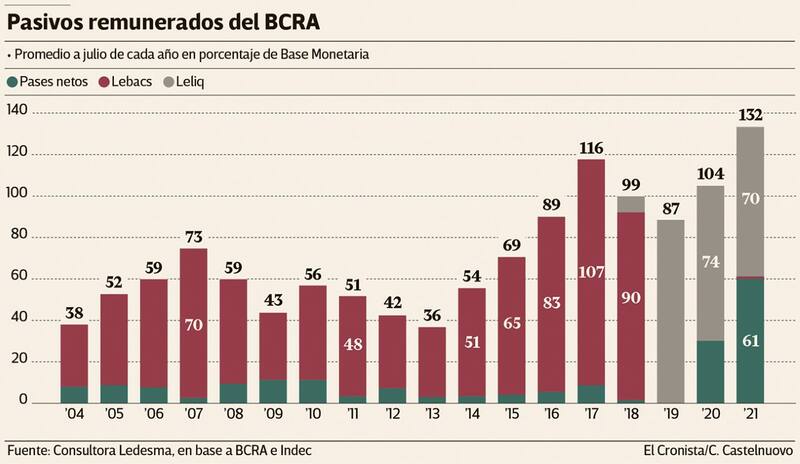 En suma, los pasivos remunerados representan un 140% de la Base Monetaria, tomando el valor de esta última al 29 de julio (última actualización).