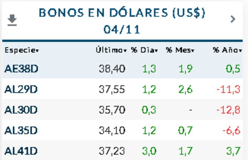 En cuanto a los emitidos bajo normas argentinas, la planilla de ByMA también mostró un cierre alcista e incluso con mejores números. El AL41D se disparó 3%, mientras que el AL30D apenas subió 0,3 por ciento.