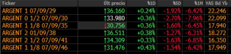 En tanto, el GD30 subió 0,35%, aunque su rendimiento sigue arriba del 22 por ciento.
