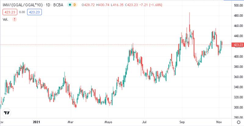 Medido al dólar contado con liquidación implícito en el ADR de Banco Galicia, el Merval se ubicó en u$s 423 unidades.