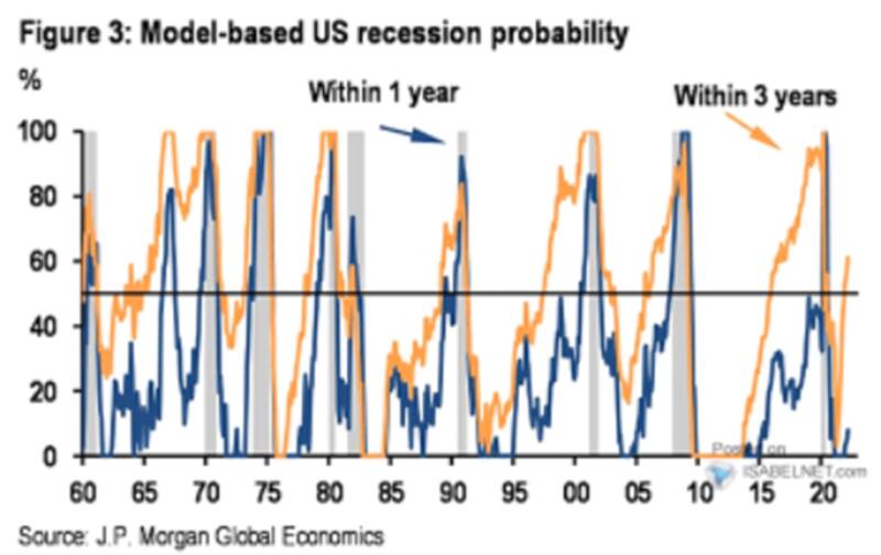 Pero cuando se toman plazos más largos, como a 3 años vista, las probabilidades de ver una recesión crece por encima del 50%.