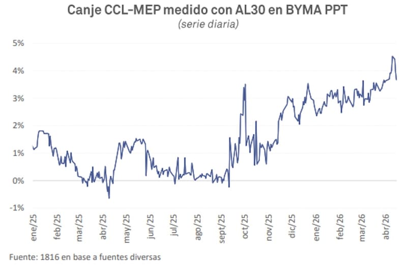 “El diferencial entre dólar MEP y CCL (canje), sigue generando una distorsión relevante a la hora de valuar los bonos. Con un canje actual en torno al 4%, los bonos que se operan en MEP están rindiendo entre 50 y 100 puntos básicos menos que sus equivalentes en cable, sin que exista ninguna diferencia en el riesgo crediticio”, indicó.