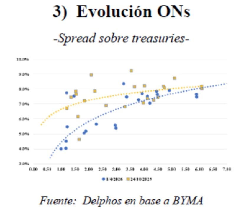 Es decir, cuando antes de las elecciones de 2025 el mercado de ONs mostraba rendimientos del 7% a un año, ahora debe buscar títulos que venzan después de 2030 para encontrar la misma tasa.