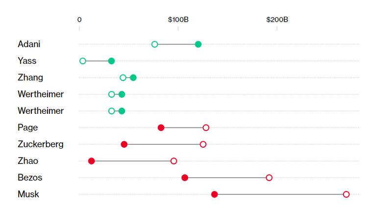Además, Musk figura en el listado especial de mayor variación en la fortuna como el peor calificado con la caída de u$d 200 mil millones, mientras que el tercero en la lista y su principal perseguidor, Gautam Adani, es quién mayor fortuna desarrolló en 2022. Este empresario es el principal operador de puertos en India.