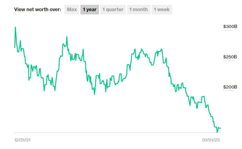 Musk fue la segunda persona en amasar una fortuna personal de más de 200.000 millones de dólares en el año 2021 junto con Jeff Bezos, creador de Amazon, pero ahora tuvo un récord negativo: es la primera persona en perder una multimillonaria cifra.