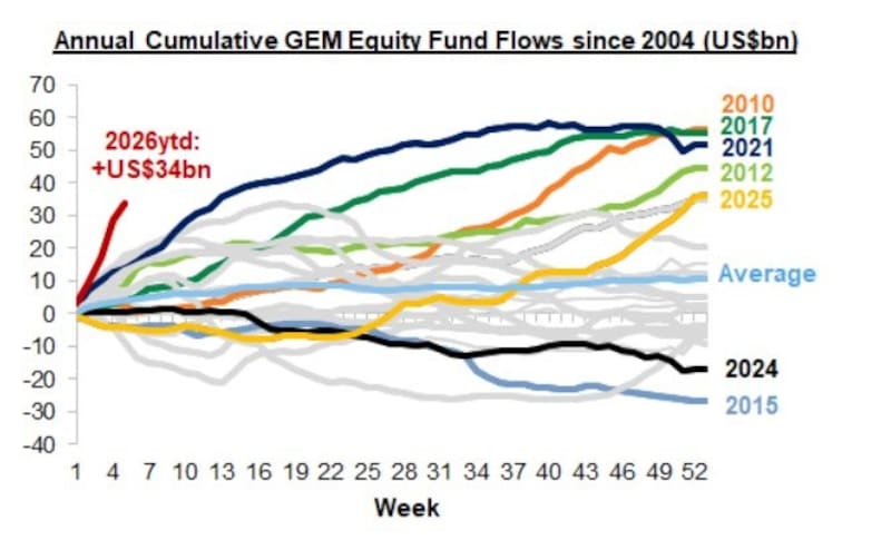 El dato no es menor: el flujo es más intenso que en los arranques de 2010, 2017 o 2021, años que luego consolidaron ciclos “risk-on” en activos emergentes.