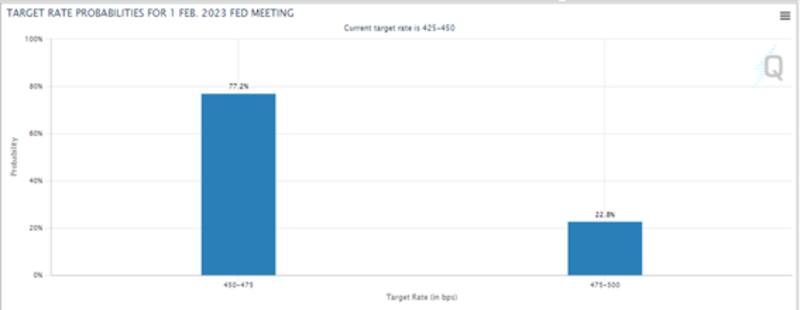 El mercado espera en su mayoría que la Fed incremente la tasa en febrero en 25 puntos básicos, para luego mantenerla en niveles altos los meses siguientes, teniendo una tasa terminal de 4,5% y 4,75 por ciento.