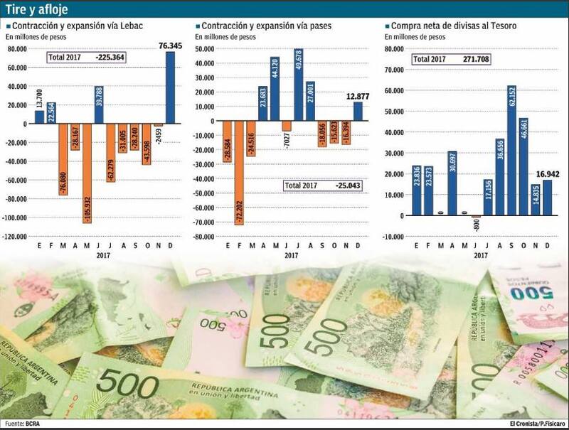 En 2017, el Banco Central logró contraer casi $ 1 billón mediante sus operaciones en el mercado secundario de Lebac. Pese a ello, el año pasado la base monetaria creció casi $ 180.000 millones, a un ritmo del 31%.