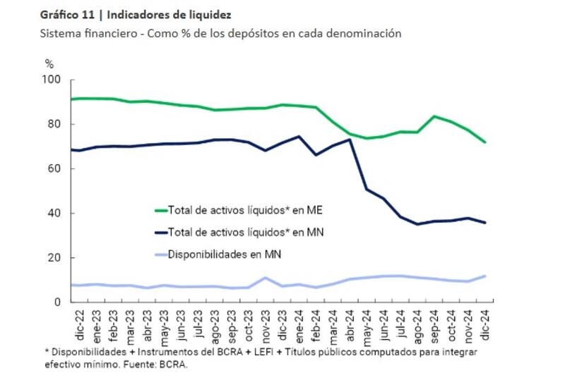 A lo largo de 2024 la liquidez amplia del sistema financiero en pesos representó el 35,9% de los depósitos en pesos al cierre del año, lo que implica una reducción de 2 p.p. respecto del registro de noviembre y prácticamente a la mitad del nivel de diciembre de 2023.