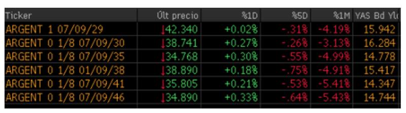 La parte media de la curva se ven subas ligeras, con el Global 2035 y Global 2038 ganando 0,3% y 0,18% respectivamente. Finalmente, en la parte mas larga, se ven subas de 0,2% y 0,33% para los bonos a 2041 y 2046.