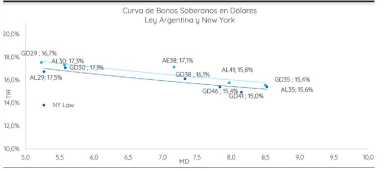 Tanto la curva de bonos de ley local como la de ley extranjera muestran una pendiente negativa y desplazada al alza, lo cual refuerza la idea de desconfianza que tiene el mercado para con la deuda argentina.