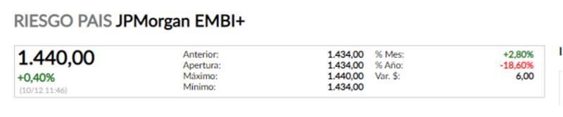 El riesgo país permanece en 1440 puntos, subiendo 6 puntos básicos respecto del cierre de ayer y manteniéndose aun un 32% por encima de los niveles vistos tras el canje de deuda a comienzo de septiembre.