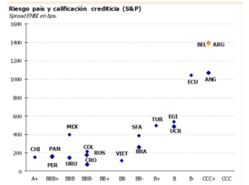 En niveles cercanos a los 1400 puntos, el riesgo país argentino es uno de los más altos del mundo, compartiendo el podio junto con Belice. Con una calificación crediticia similar (CCC+), Angola tiene un riesgo país de 1100 puntos. Los bonos Ecuador, recientemente reestructurados, operan con un riesgo país acorde a los 1050 puntos, lo cual son casi 400 puntos básicos más que el riesgo país local.