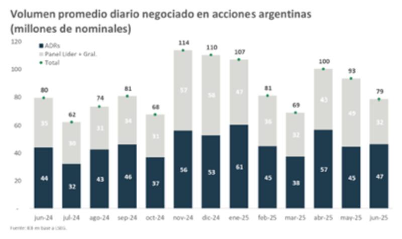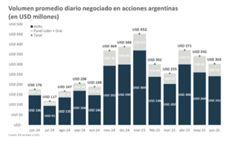En medio del ajuste, el volumen se fue comprimiendo. Hoy se operan en promedio u$s 241 millones en ADR y u$s 62 millones en la bolsa local, lo cual suma un total promedio diario de u$s 303 millones.