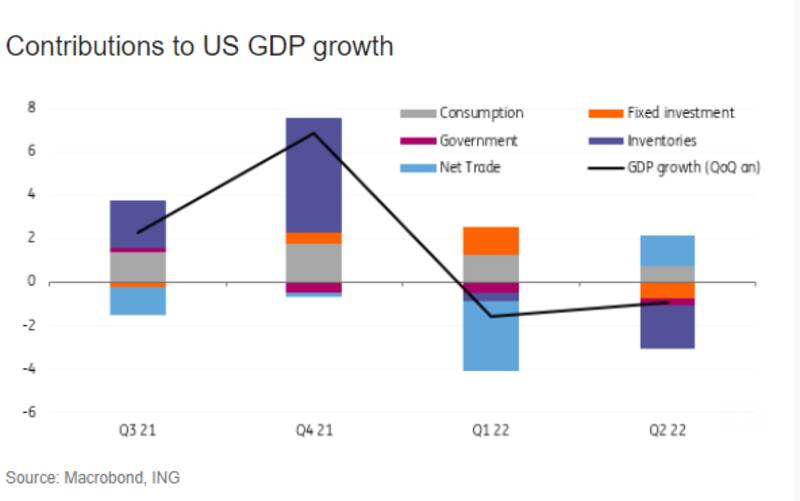 "Tenemos una recesión técnica en EE. UU. con una contracción del PIB del segundo trimestre a una tasa anualizada del 0,9 % después de una caída anualizada del 1,6 % en el primer trimestre. La razón principal fue una gran reducción de los inventarios que eliminó 2 puntos porcentuales de la tasa de crecimiento general, mientras que la inversión residencial se contrajo un 14 % anualizado", dijeron