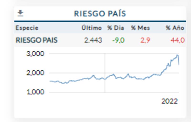 Gracias al rebote de los bonos actual, el riesgo pais evidencia una fuerte caída, retrocediendo hasta los 2443 puntos. El indicador que mide JP Morgan sube 170% desde el canje aunque tambien cae 17% desde sus máximos.
