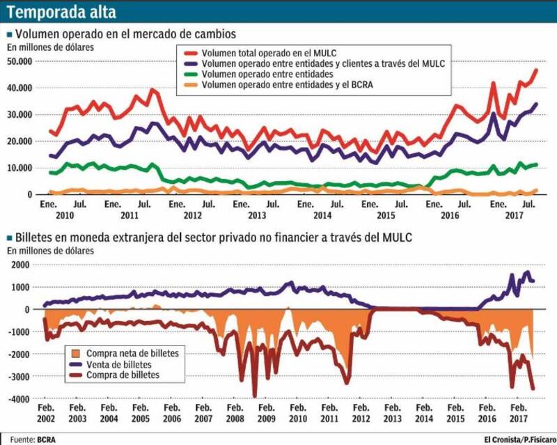 La dolarización previa a las elecciones primarias se hizo sentir en el volumen operado en el Mercado Único y Libre de Cambios (MULC), que en agosto alcanzó los u$s 46.556 millones (unos u$s 2100 millones diarios) y superó por $ 4300 millones el récord anterior, que se había registrado en julio. En su informe cambiario mensual, el Banco Central (BCRA) señaló: "Este máximo representó un incremento de 62% respecto del mismo mes del año 2016, explicado en mayor medida por las operaciones concertadas entre las entidades y sus clientes, y en menor medida, por la operatoria entre entidades, y entre éstas últimas y el BCRA".