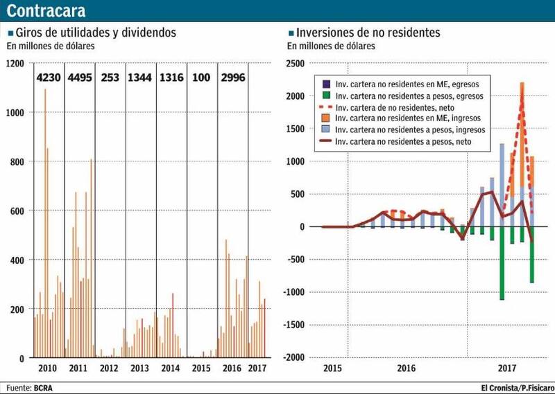 De acuerdo con los datos publicados en el último informe del Mercado Único y Libre de Cambios (MULC) elaborado por el Banco Central (BCRA), en julio se registró una salida bruta por u$s 238 millones en concepto de giro de utilidades. Ese monto casi duplicó al de julio de 2016, que había sido de u$s 125 millones. Los sectores que más dólares enviaron al exterior fueron las entidades financieras (u$s 144 millones) y el rubro "Alimentos, bebidas y tabaco" (u$s 31 millones).