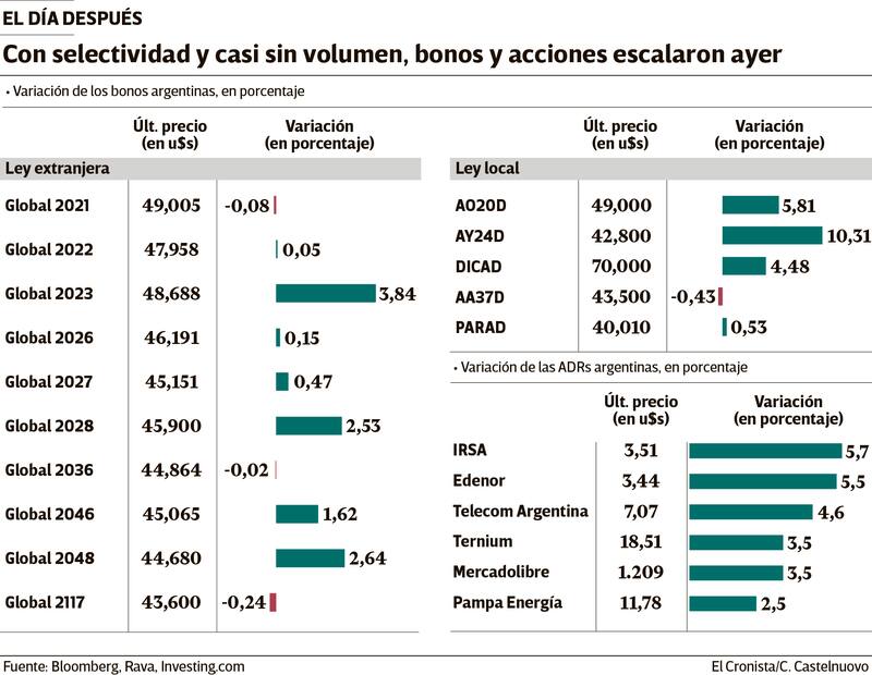 Los activos financieros locales lograron al fin salir del letargo en el que permanecieron durante las últimas semanas. Si bien continúan atravesados por la incertidumbre que rodea al futuro económico del país, tanto los bonos soberanos en dólares como las acciones de las compañías argentinas intercalaron ayer una rueda de significativos avances tras el exitoso resultado de adhesión al canje de deuda, dado a conocer el lunes por el presidente Alberto Fernández.