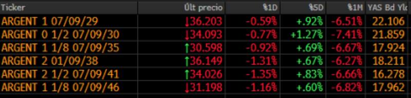 Entre los ley local, la planilla de ByMA mostró un panorama malo también. El AL41D lideró las bajas, con un retroceso de 1,15 por ciento. Asimismo, el AL30D cayó 0,11% y su TIR se ubica en 22,22 por ciento.