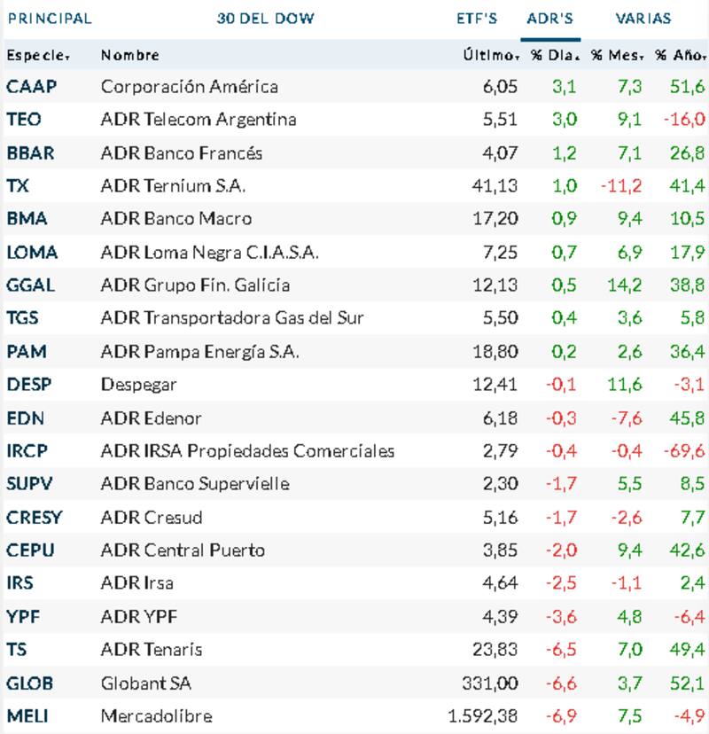 En cuanto a los ADR de empresas argentinas que cotizan en Wall Street, se vio una pizarra dividida entre velas verdes y rojas.