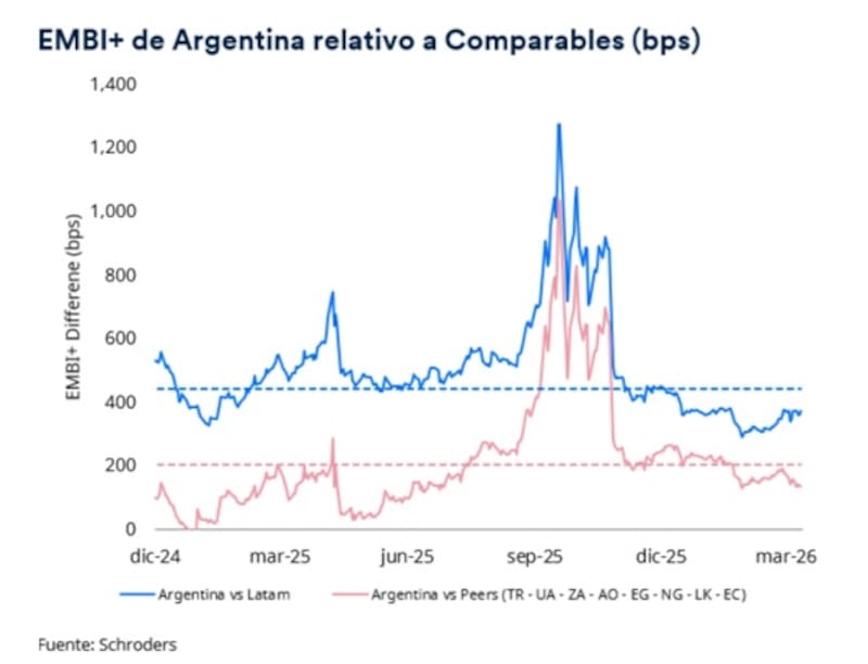 “Desde que comenzó la guerra, Argentina (junto con Ecuador, Angola, Colombia y Nigeria) comprimió sus spreads. De hecho, la Argentina viene comprimiendo spreads relativo a la mediana de sus pares más cercanos como Turquía, Ucrania, Sudáfrica, Angola, Egipto, Nigeria, Sri Lanka, Pakistan y Ecuador”, detalló.