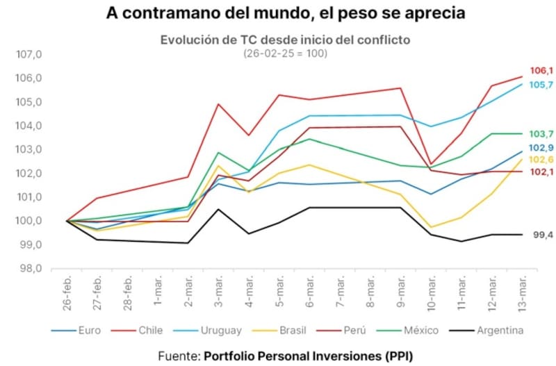 Sin embargo, el peso argentino se mantuvo estable durante el estallido de la guerra. Mientras el dólar index sube 3% desde el inicio de la guerra y las monedas de la región se devalúan entre 3% y 6%, el peso argentino se apreció 1%.
