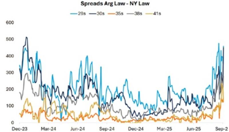 "Tras la fuerte recuperación impulsada por el apoyo de EEUU, los spreads de los bonos de ley argentina frente a sus pares de ley Nueva York se mantienen cerca de los máximos alcanzados durante la administración Milei. Seguimos recomendando rotar hacia bonos de ley argentina, ya que esperamos que los spreads se normalicen en el corto plazo", afirmaron.