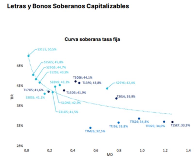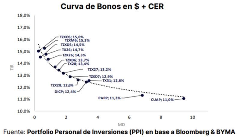 "Para posicionarnos en la curva de tasa fija, continuamos prefiriendo el tramo corto (previo octubre), aprovechando la pendiente negativa de la curva y las tasas reales que ofrecen estos títulos, con menor volatilidad que el tramo largo. Para perfiles menos adversos al riesgo, los bonos CER con vencimiento a lo largo 2026 continúan en precios atractivos con tasas reales en el orden del 15% manteniendo la cobertura inflacionaria", detalló.