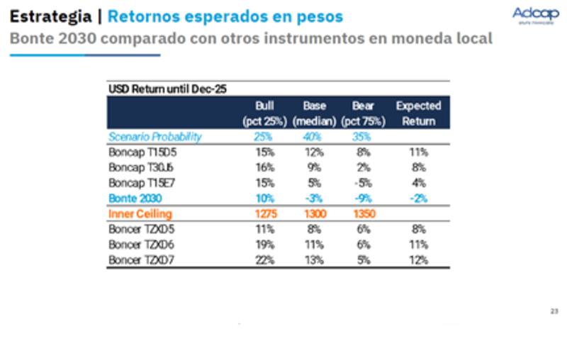 En cambio, en títulos a tasa fija, bajo distintos escenarios, es del 10% al 16% en el escenario positivo. En cambio, en un contexto donde la nominalidad de la macro se dispara, los bonos a tasa fija podrían dejar ganancias de 8% pero también perdidas de hasta 9% en dolares.