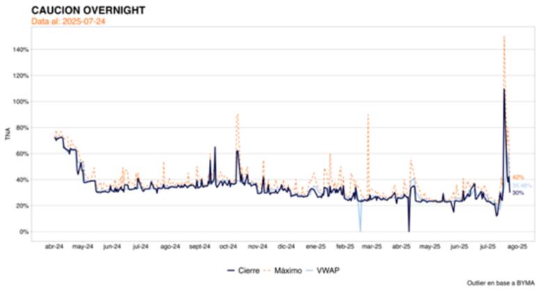 Dado que la tasa de interés de corto plazo la define el mercado, ya sin la referencia del BCRA, la tasa de caución parecería ser una de las guías sobre la salud de tasas y volatilidad de las mismas.