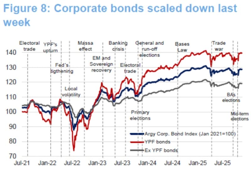 Esto se evidencia en el índice general de bonos corporativos, así como también en la deuda de YPF y en el índice que excluye dichos bonos.