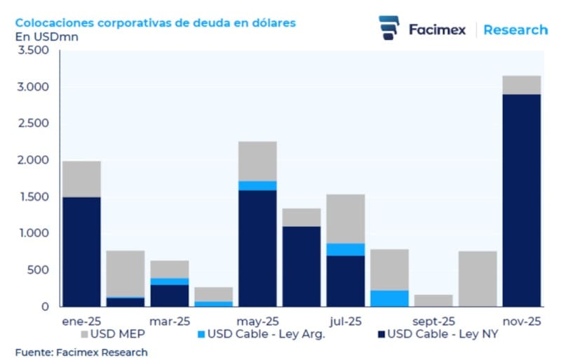 “Las compañías y provincias argentinas aprovecharon el momentum poselectoral para salir a buscar financiamiento en el exterior a tasas de un dígito. En noviembre las emisiones de deuda corporativa y sub-soberana bajo ley internacional acumulan u$s 3400 millones, una cifra récord para un mes bajo la administración de Javier Milei (cuando todavía resta una semana para terminar el mes)”, detallaron.